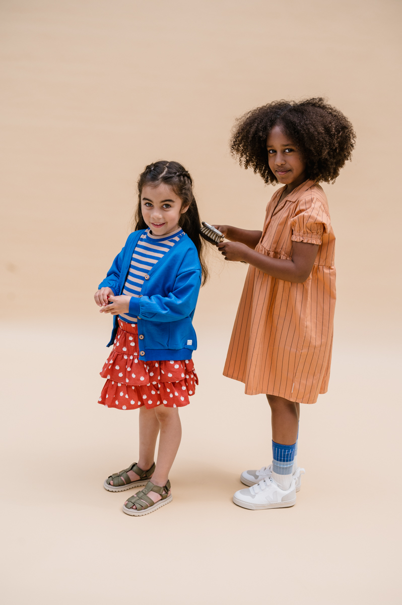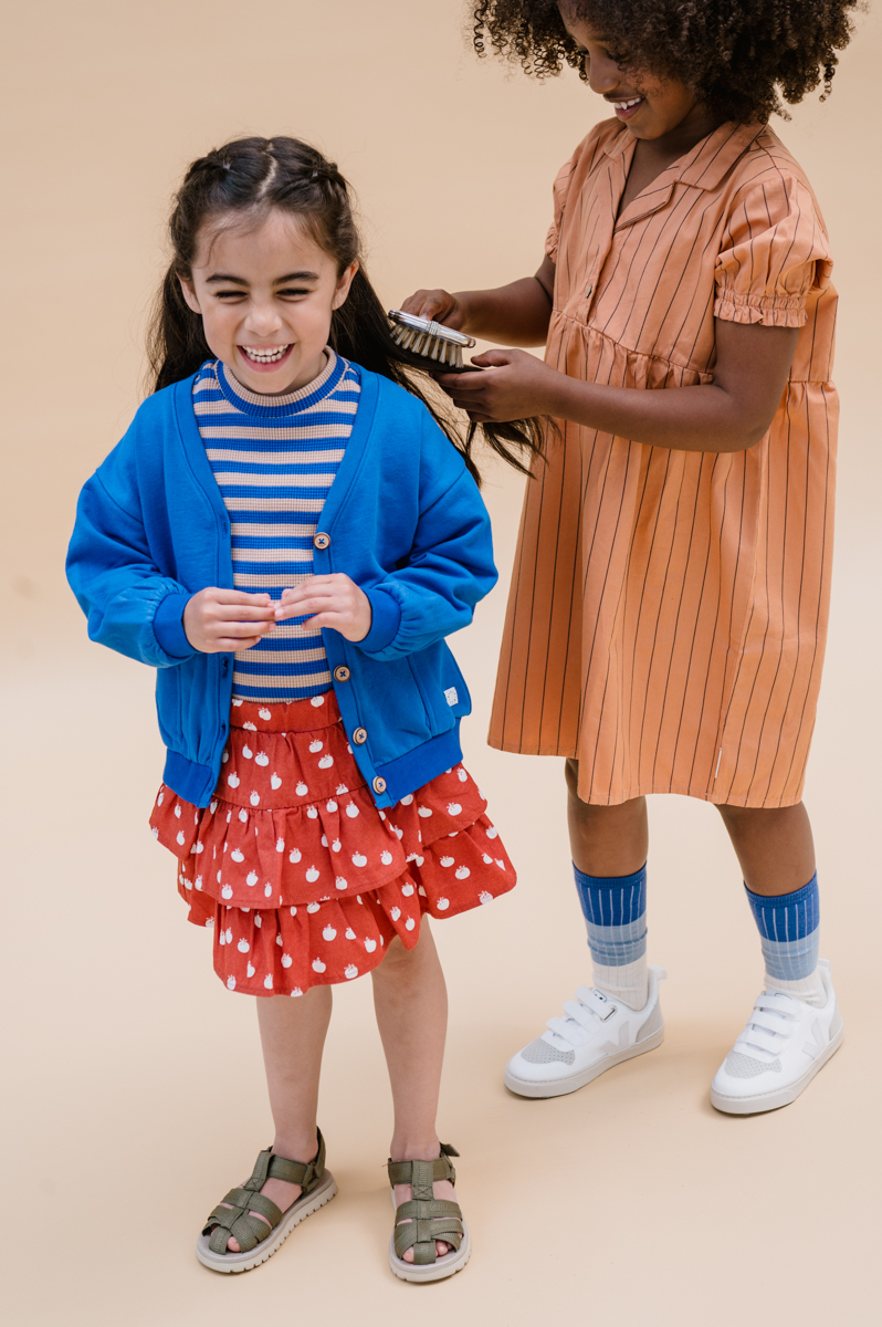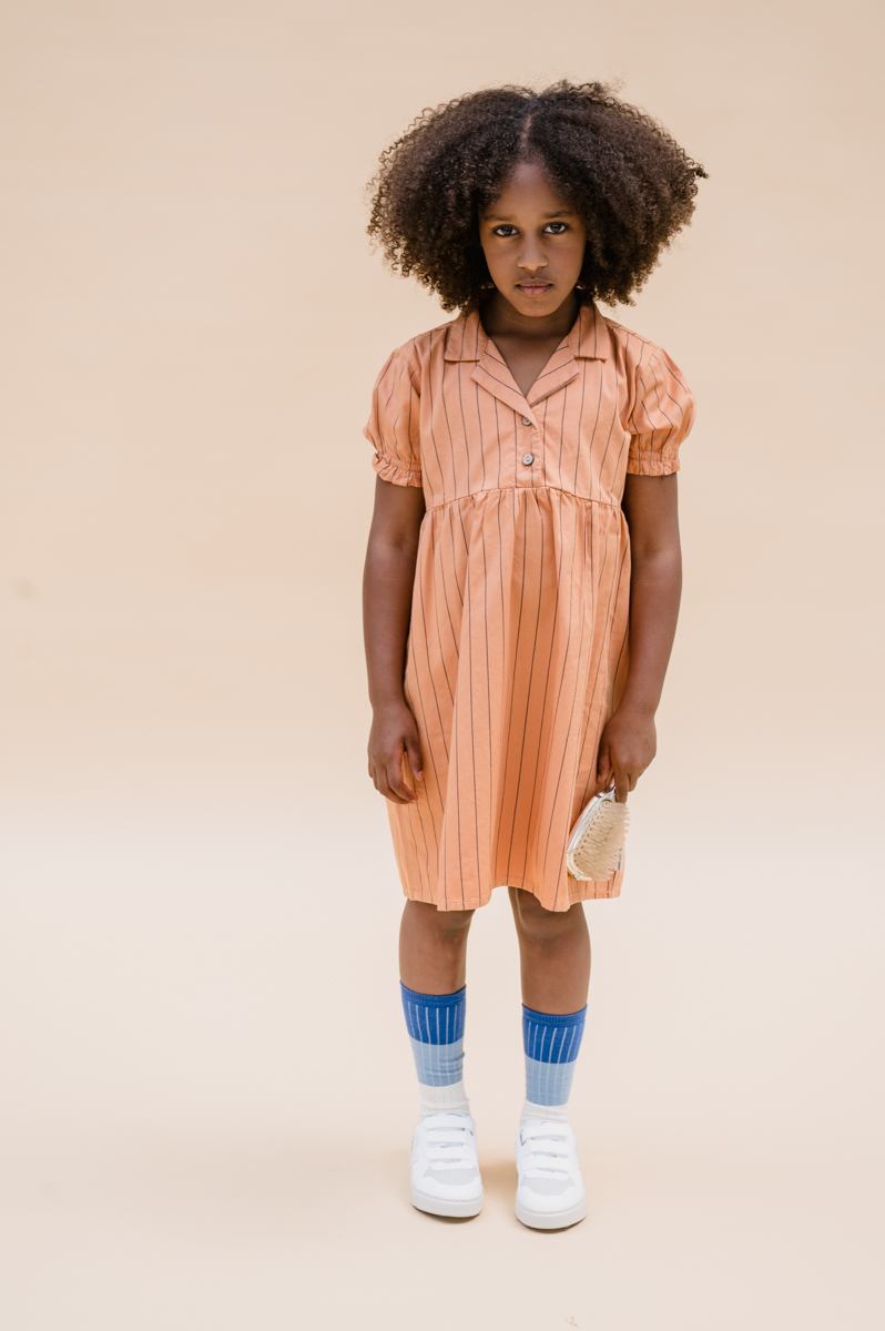 De Sproet & Sprout collar dress tutti frutti stripe print is geïnspireerd op een Mediterraans schooluniform, maar dan in een stoer jasje gestoken. De terracotta meisjesjurk met krijtstreep heeft een klassiek kraagje, speelse houten knopen, romantische pofmouwen met ruffles en een A-lijn model. Gemaakt van 100% katoen. Beschikbaar in maat 12 maanden tot en met 12 jaar.